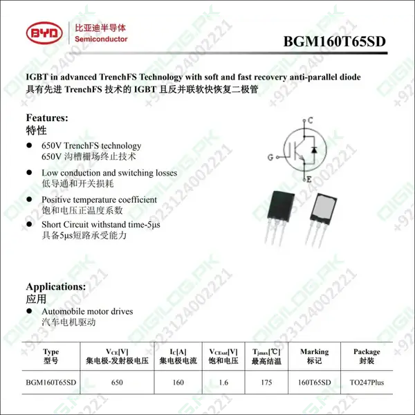 BGM160T65SD is a high-performance IGBT (Insulated Gate Bipolar Transistor) with advanced 650V TrenchFS technology, designed for applications that demand high efficiency and reliability. This IGBT features low conduction and switching losses, positive temperature coefficient, and an integrated soft and fast recovery anti-parallel diode, making it ideal for use in automotive motor drives.