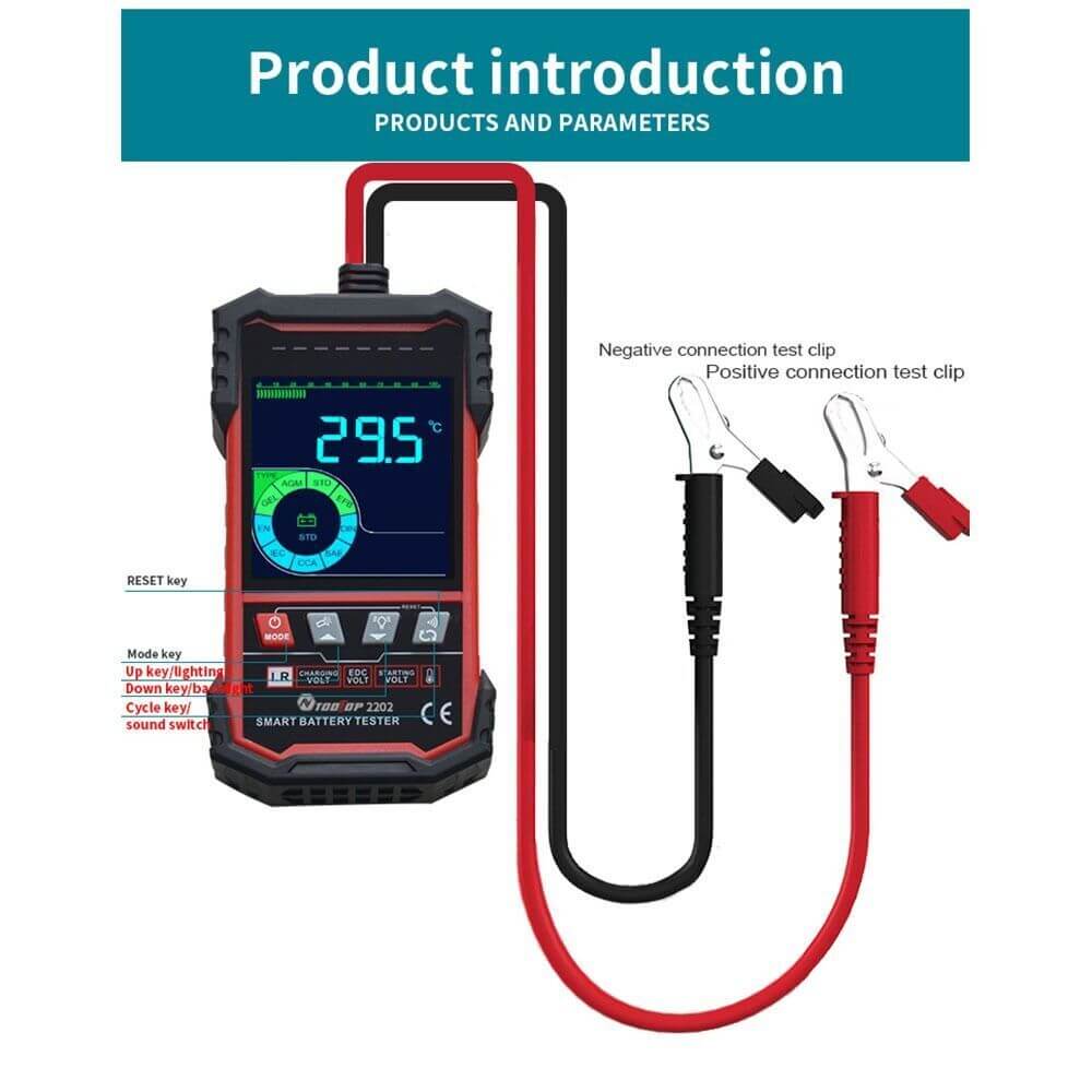 The TOOLTOP ET2202 is an intelligent battery tester for 12V and 24V automotive lead-acid batteries. This handheld device features a 3.2-inch color LCD screen and measures battery health by analyzing its voltage, internal resistance, and discharge current.
